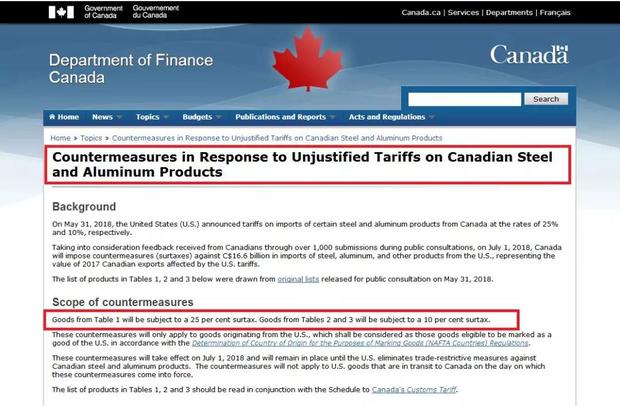 加拿大財(cái)政部官網(wǎng)發(fā)布的公告,標(biāo)題可以說是相當(dāng)?shù)刂笔阈匾芰耍骸秾幽么箐撲X產(chǎn)品受到不公平關(guān)稅待遇的反擊措施》(Countermeasures in Response to Unjustified Tariffs on Canadian Steel and Aluminum Products)。抱怨三連:countermeasures(對抗措施), in Response to(對……做出反應(yīng)),unjustified(不公平的)——看得出,加拿大是真生氣了。