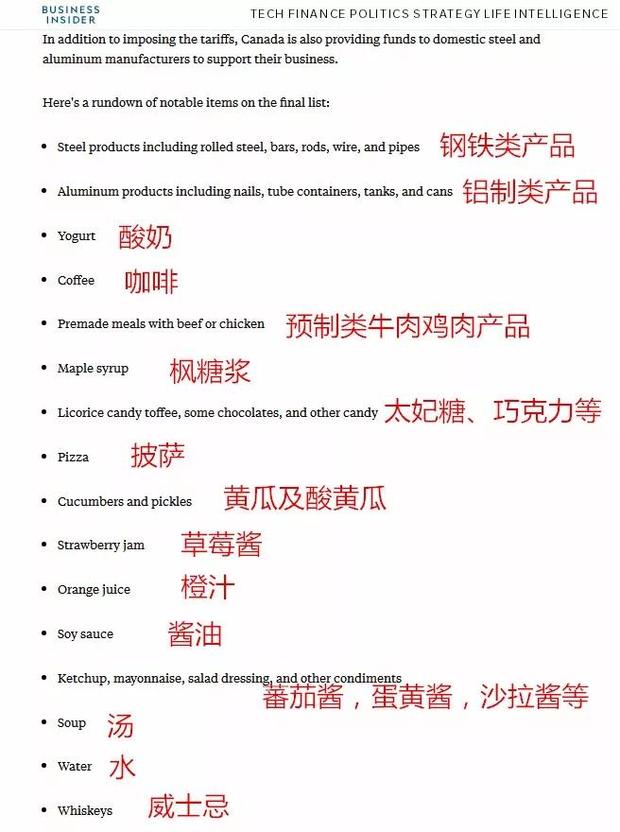 美國網(wǎng)站Business Insider貼心做了個(gè)大致梳理,不難看出,這份后續(xù)打擊清單,正如加拿大廣播公司評論所說,乍看上去簡直像是家庭主婦去超市的購物單:從比薩餅到草莓醬,從威士忌到酸黃瓜,跟第一輪打擊的鋼鋁顯得實(shí)在不匹配。