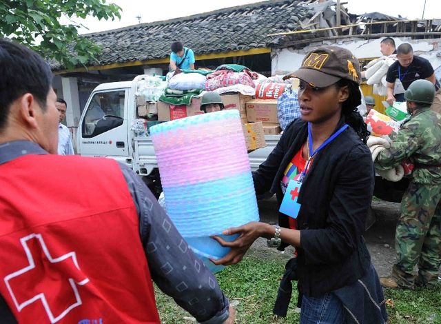 2008年5月17日,在“5·12”汶川特大地震重災區(qū)四川省什邡市湔氐鎮(zhèn)白虎頭村,來自非洲的志愿者瑪利亞在搬運救援物資。 新華社記者劉海峰攝