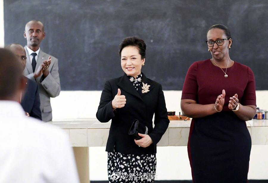 23日上午,國家主席習近平夫人彭麗媛參觀了盧旺達法維女子中學。全校師生聚集在學校大禮堂,歡迎中國貴賓到來。當彭麗媛走進會場時,掌聲雷動。同學們為彭麗媛呈上了一場精彩演出:學校校歌合唱高亢激昂、中國經典名曲《茉莉花》悠揚嘹亮、盧旺達民族舞蹈熱情奔放。彭麗媛不斷為學生的出色表演鼓掌。演出結束后,彭麗媛向學校贈送了一批教學用品,祝愿學校越來越好。一位同學向彭麗媛贈送了一幅自己專門創作的畫像。彭麗媛高興地接過畫像大加稱贊,親吻這位同學的臉頰,并同她親切擁抱。彭麗媛對全校師生的熱情接待表示感謝。