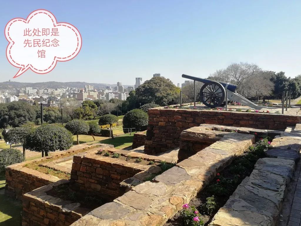站在聯邦大廈前,可以從山坡上俯瞰比勒陀利亞全城。對面山坡上方形建筑,就是南非著名的先民紀念館(Voortrekker Monument)。