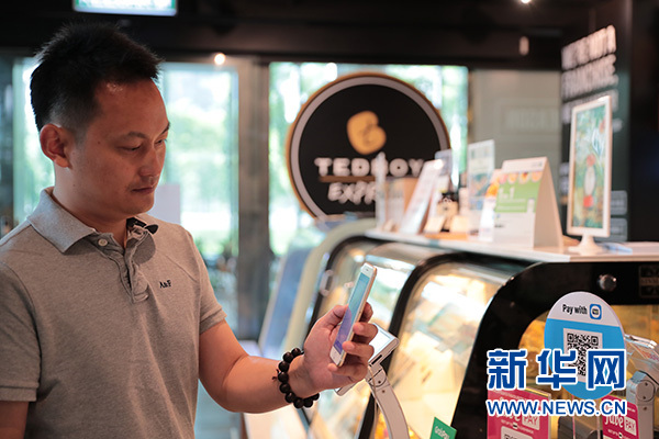 8月8日,在馬來(lái)西亞吉隆坡,一名男士用電子錢包刷二維碼買咖啡。 新華社記者 朱煒 攝