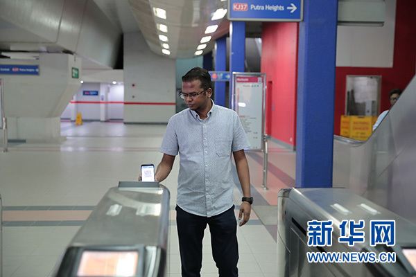 8月8日,在馬來(lái)西亞吉隆坡,乘客用電子錢包刷二維碼坐地鐵。 新華社記者 朱煒 攝