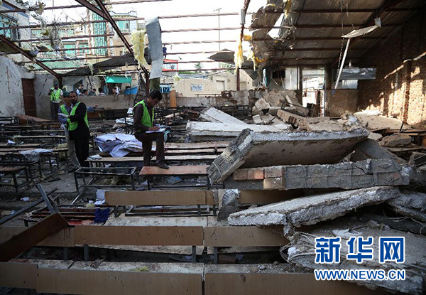 新華社報道員在現(xiàn)場看到,此次襲擊威力巨大,遇襲教室內的天花板在爆炸中嚴重受損,從黑板、座椅到地面,到處都能看到尚未來得及清理的血跡,學員們的課本、文具等四處散落。教室外不時有家長趕來,急切打聽自家孩子的下落。