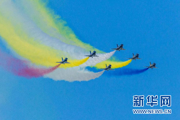 蔚藍的天空下,八一飛行表演隊成功上演了六機向下開花、五機水平向上開花、四機編隊橫滾、單機蛇行扭轉(zhuǎn)等21個高難度飛行動作,贏得了現(xiàn)場觀眾陣陣掌聲。