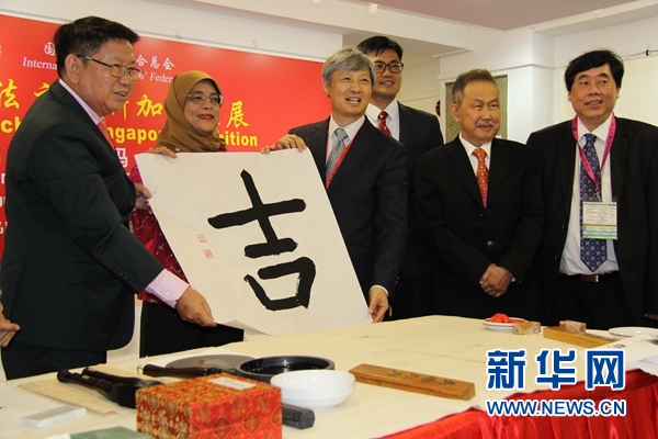 新加坡馬來族女總統(tǒng)哈莉瑪興致勃勃地?fù)]毫?xí)鴮懥藵h字“吉”,并觀賞了書法家代表的現(xiàn)場書法表演。哈莉瑪在賀詞中說,中華書法是眾多新加坡人學(xué)習(xí)的傳統(tǒng)藝術(shù),新加坡書法家協(xié)會通過開設(shè)書法課程和舉辦揮春大會等方式,在新加坡多元文化背景下為加深跨文化交流做出了貢獻(xiàn)。此次國際書法交流大展展出的作品風(fēng)格各異,無疑能帶動書法同道的藝術(shù)交流。