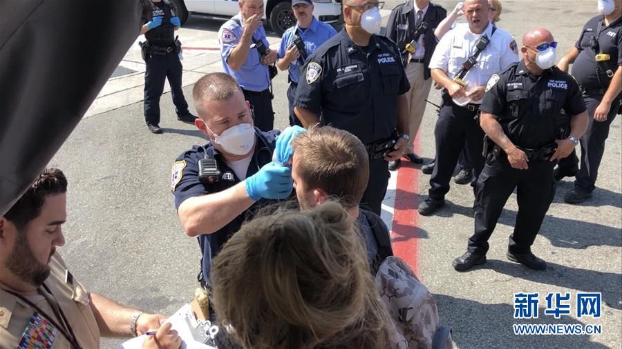9月5日,在美國紐約肯尼迪機場,警察為阿聯酋航空公司EK203航班上的乘客查體溫。新華社發
