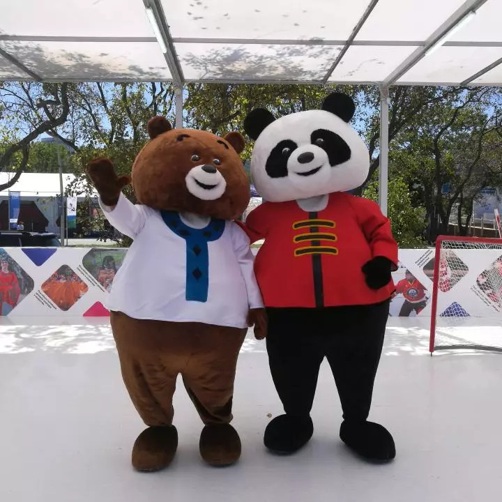 第四屆東方經濟論壇配套展示項目遠東風采街上,可愛的“中國熊貓”和“俄羅斯棕熊”一起打冰球(新華社記者蔣國鵬攝)