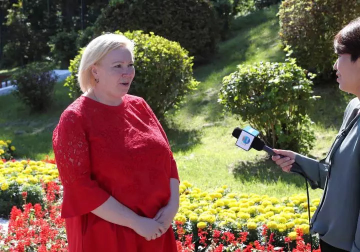 勘察加邊疆區旅游和對外聯絡局局長葉連娜·斯特拉托諾娃接受新華社記者采訪(新華社記者李建敏攝)