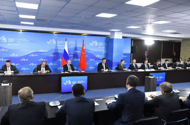9月11日,國家主席習近平在符拉迪沃斯托克和俄羅斯總統(tǒng)普京共同出席中俄地方領導人對話會。 新華社記者 饒愛民攝