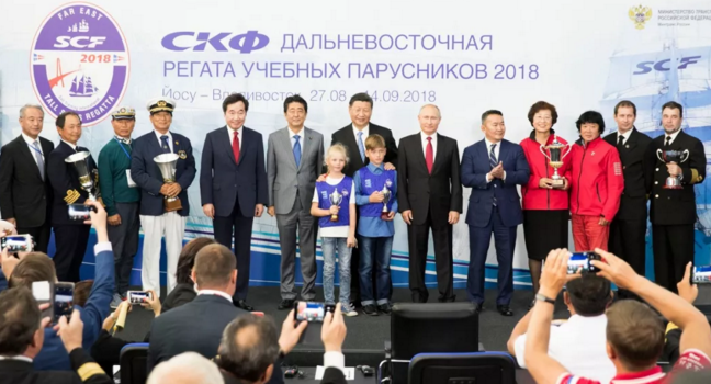 9月12日,第四屆東方經濟論壇全會在符拉迪沃斯托克舉行。中國國家主席習近平、俄羅斯總統(tǒng)普京、蒙古國總統(tǒng)巴特圖勒嘎、日本首相安倍晉三、韓國總理李洛淵等出席。這是全會后,與會各國領導人共同出席第三屆“遠東杯”國際帆船拉力賽第一賽段頒獎儀式。新華社記者 黃敬文 攝