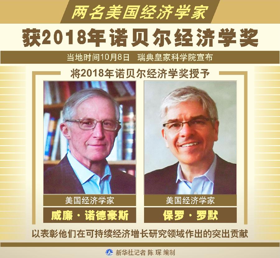 新華社斯德哥爾摩10月8日電(記者和苗 付一鳴)瑞典皇家科學院8日宣布,將2018年諾貝爾經濟學獎授予美國經濟學家威廉·諾德豪斯和保羅·羅默,以表彰他們在可持續經濟增長研究領域作出的突出貢獻。