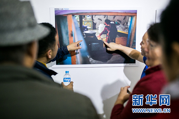 10月14日,在蒙古國首都烏蘭巴托,人們觀看“今日蒙古國”國際攝影采風(fēng)活動(dòng)作品展。新華社記者 白雪騏 攝