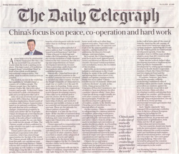 英國時間10月19日,英國主流大報《每日電訊報》紙質版和網絡版同時刊登我駐英國大使劉曉明題為《中國致力于和平、合作與奮斗》的署名文章。全文如下: