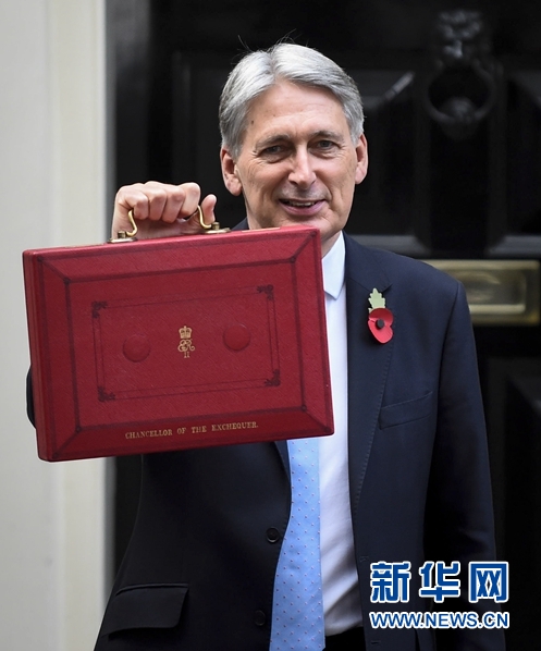 10月29日,在英國倫敦,英國財政大臣菲利普·哈蒙德展示手中的“預算盒”,準備向議會提交預算案。當天他在議會公布預算案時表示,英國將結束財政緊縮,努力爭取“脫歐”最好結果的同時,為“脫歐”各種可能性做好準備。 新華社發(史蒂芬·程 攝)