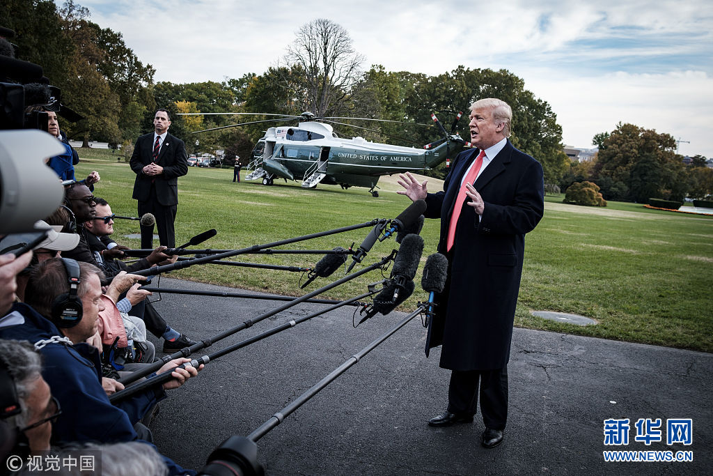 當?shù)貢r間2018年10月31日,美國華盛頓,美國總統(tǒng)特朗普啟程前往佛羅里達州出席競選集會,在白宮南草坪發(fā)表講話。特朗普稱,計劃部署在美墨邊境的現(xiàn)役軍人數(shù)量或增加至15000人,以嚴防來勢洶洶的“大篷車”移民。(圖片來源:視覺中國)