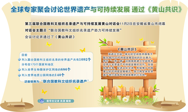 全球?qū)<揖蹠懻撌澜邕z產(chǎn)與可持續(xù)發(fā)展 通過《黃山共識》 新華社記者 肖瀟 編制