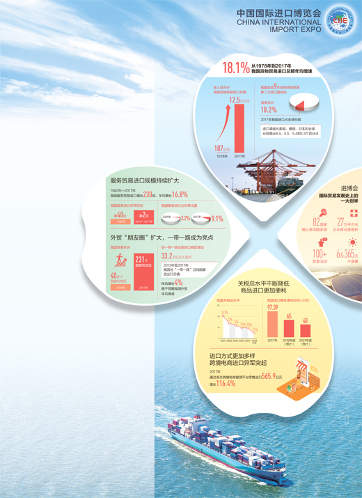 中國長期堅持擴大進口,尤其是黨的十八大以來,明確提出主動擴大進口,并取得明顯成效。從貨物貿(mào)易來看,1978年到2017年,按人民幣計價,我國進口總額從187億元提高到12.5萬億元,年均增速為18.1%。服務(wù)貿(mào)易進口方面,1982年到2017年,我國服務(wù)貿(mào)易進口增長230倍,年均增長16.8%。