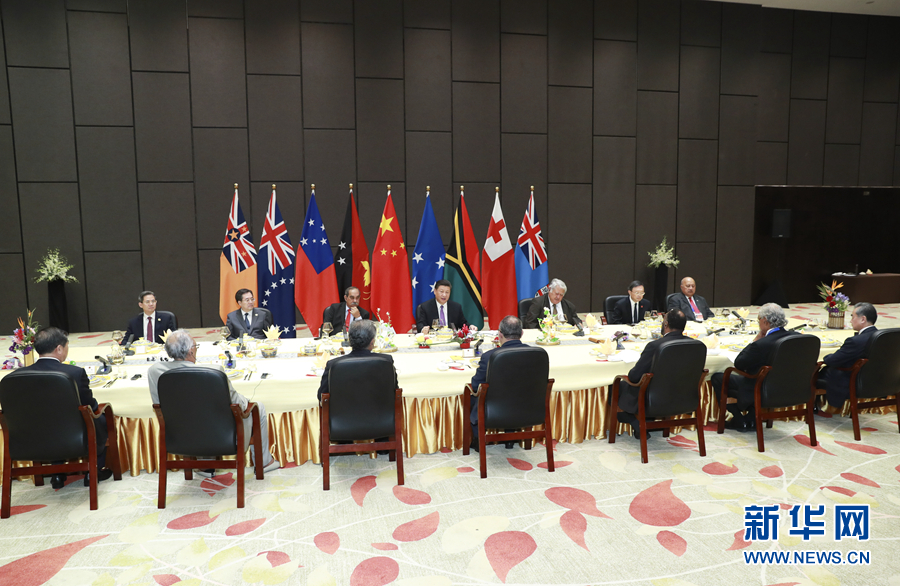 11月16日,國家主席習(xí)近平在莫爾茲比港同巴布亞新幾內(nèi)亞總理奧尼爾、密克羅尼西亞聯(lián)邦總統(tǒng)克里斯琴、薩摩亞總理圖伊拉埃帕、瓦努阿圖總理薩爾瓦伊、庫克群島總理普納、湯加首相波希瓦、紐埃總理塔拉吉等建交太平洋島國領(lǐng)導(dǎo)人以及斐濟(jì)政府代表、國防部長昆布安博拉舉行集體會晤。習(xí)近平主持會晤并發(fā)表主旨講話。 新華社記者 謝環(huán)馳 攝