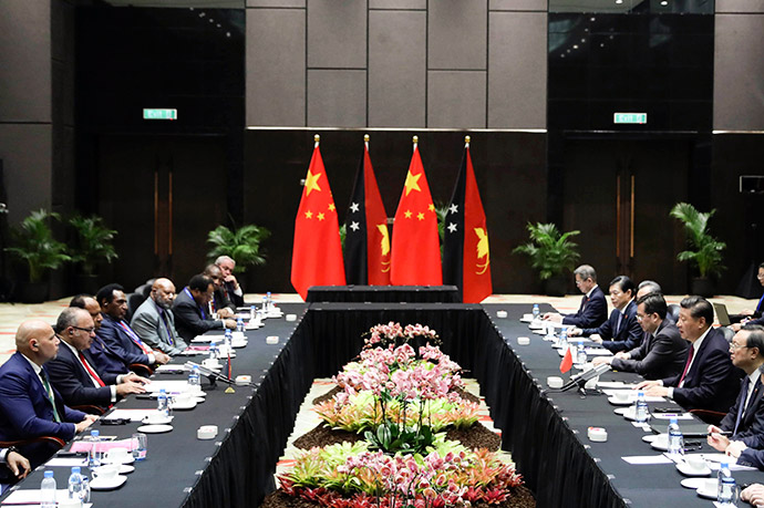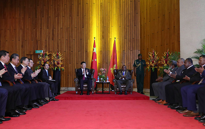 11月16日,國家主席習(xí)近平在莫爾茲比港同巴布亞新幾內(nèi)亞總理奧尼爾、密克羅尼西亞聯(lián)邦總統(tǒng)克里斯琴、薩摩亞總理圖伊拉埃帕、瓦努阿圖總理薩爾瓦伊、庫克群島總理普納、湯加首相波希瓦、紐埃總理塔拉吉等建交太平洋島國領(lǐng)導(dǎo)人以及斐濟(jì)政府代表、國防部長昆布安博拉舉行集體會(huì)晤。習(xí)近平主持會(huì)晤并發(fā)表主旨講話。新華社記者 龐興雷 攝