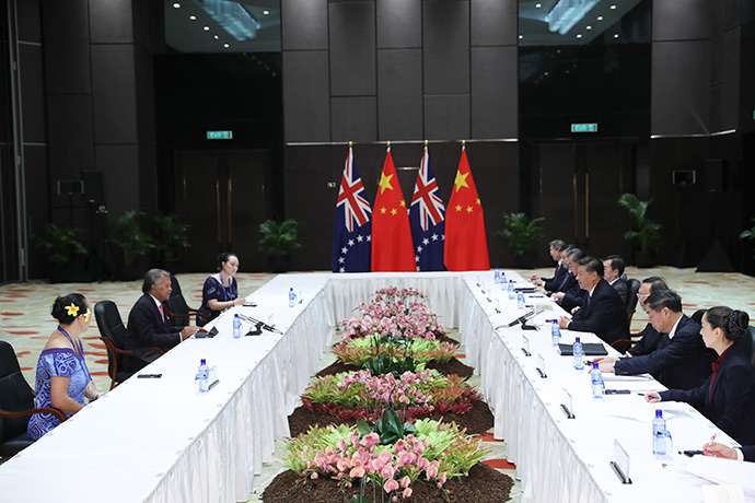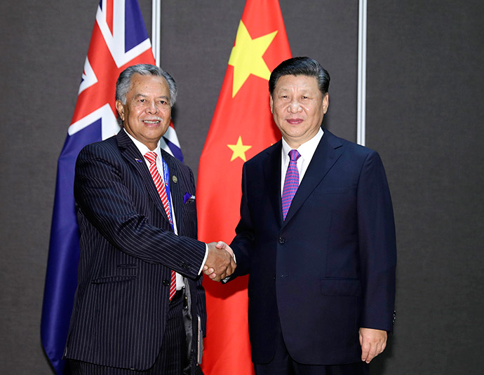 11月16日,國家主席習(xí)近平在莫爾茲比港分別會(huì)見建交太平洋島國領(lǐng)導(dǎo)人。這是習(xí)近平會(huì)見庫克群島總理普納。新華社記者 丁林 攝