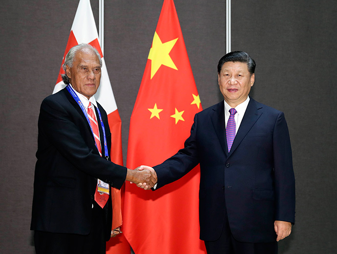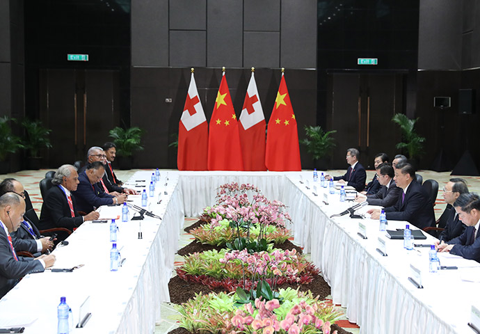 11月16日,國家主席習(xí)近平在莫爾茲比港分別會(huì)見建交太平洋島國領(lǐng)導(dǎo)人。這是習(xí)近平會(huì)見湯加首相波希瓦。新華社記者 丁林 攝