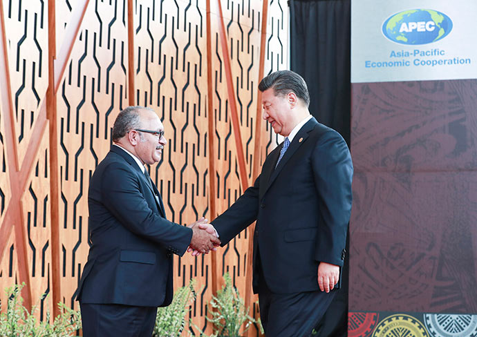 11月17日,國家主席習近平應邀出席在巴布亞新幾內亞莫爾茲比港舉行的亞太經合組織工商領導人峰會并發(fā)表題為《同舟共濟創(chuàng)造美好未來》的主旨演講。同日,習近平還出席了亞太經合組織領導人同工商咨詢理事會代表對話會,受到巴布亞新幾內亞總理奧尼爾的熱情迎接。新華社記者 龐興雷 攝