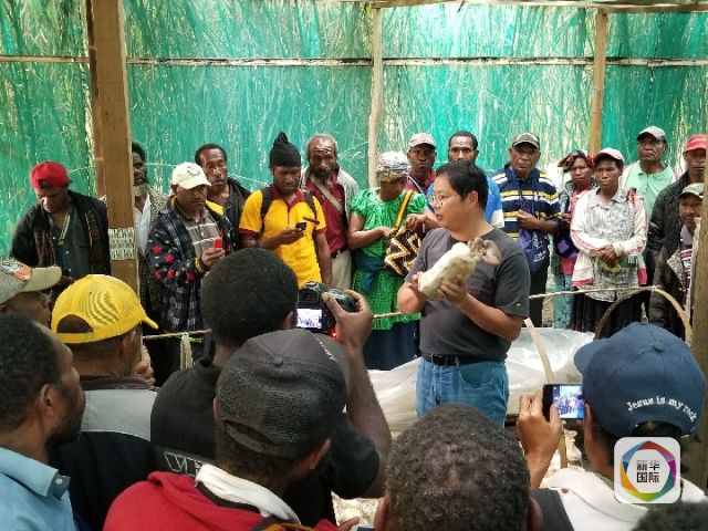 2018年9月4日,在巴布亞新幾內亞東高地省戈羅卡市中國福建省援巴新菌草與旱稻技術合作項目基地,項目組組長林應興向當地民眾講解菌草種植技術。(新華社記者莫華英攝)