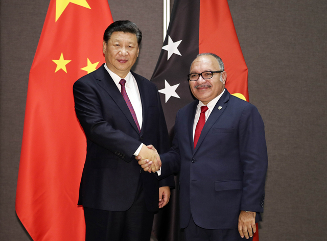 2018年11月16日,國家主席習近平在莫爾茲比港同巴布亞新幾內亞總理奧尼爾會談。(新華社記者丁林攝)