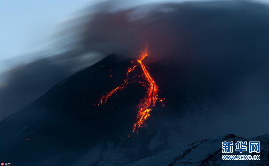 當地時間2018年12月8日,意大利西西里島,位于西西里島的東岸活火山埃特納火山再度活躍噴發,熔巖火山灰滾滾噴射。