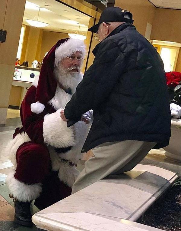 12月9日,美國特拉華州,一位裝扮成“圣誕老人”的男子向一位路過的二戰老兵屈膝致敬。