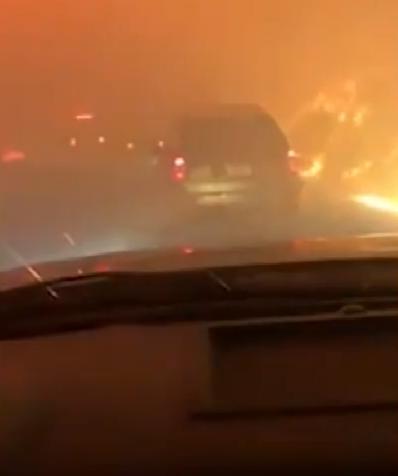 美國加州煙霧鎖城,路兩側火光沖天