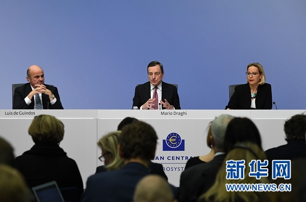 1月24日,在德國法蘭克福的歐洲中央銀行總部,歐洲央行行長德拉吉(中)和副行長德金多斯(左)出席新聞發布會。新華社記者 逯陽 攝