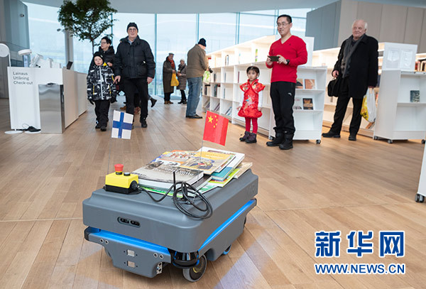 2月4日,機(jī)器人載著捐贈的英文圖書在芬蘭赫爾辛基奧迪圖書館內(nèi)巡游展示,引得許多讀者駐足觀看。新華社發(fā)(馬蒂·馬蒂凱寧 攝)