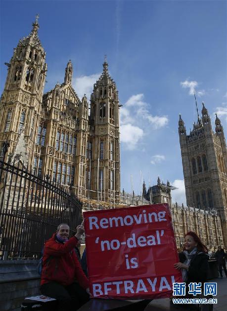 3月14日,在英國倫敦,示威者手持標語站在議會大廈外。新華社記者韓巖攝