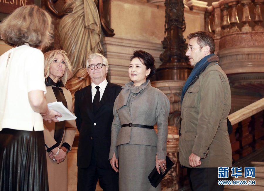 當地時間3月25日,國家主席習近平夫人彭麗媛在法國總統夫人布麗吉特陪同下參觀位于巴黎市第九區的法國巴黎歌劇院。 新華社記者 丁林 攝