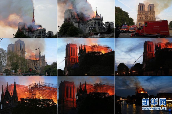 這張拼版照片顯示的是4月15日,在法國巴黎,巴黎圣母院燃起大火。當(dāng)?shù)貢r間15日傍晚,位于巴黎市中心、有著800多年歷史的巴黎圣母院發(fā)生大火,熊熊烈火之中,巴黎圣母院塔尖轟然倒塌,整座建筑損毀嚴(yán)重。新華社發(fā)