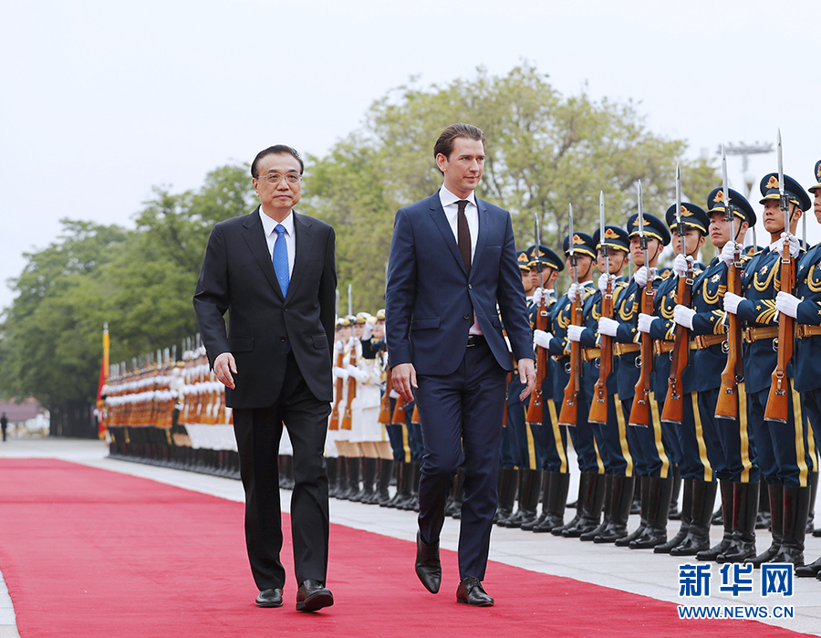 4月28日,國務(wù)院總理李克強(qiáng)在北京人民大會堂同奧地利總理庫爾茨舉行會談。這是會談前,李克強(qiáng)在人民大會堂東門外廣場為庫爾茨舉行歡迎儀式。新華社記者 劉彬 攝