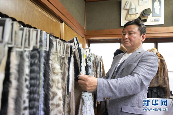 這是5月17日在日本和歌山縣,岡田織物現任社長岡田次弘挑選人造毛皮產品。新華社記者 杜瀟逸 攝