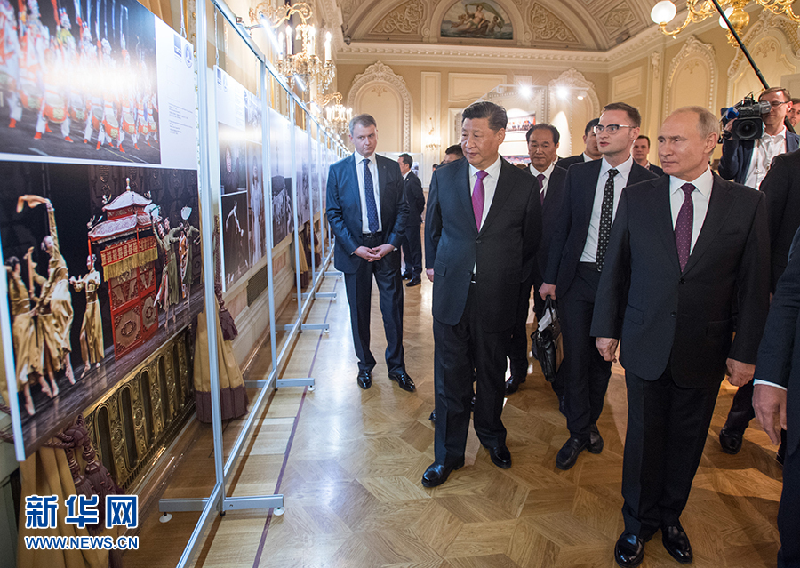6月5日,國(guó)家主席習(xí)近平和俄羅斯總統(tǒng)普京在莫斯科大劇院共同出席中俄建交70周年紀(jì)念活動(dòng)。這是兩國(guó)元首共同參觀中俄建交70周年圖片展。 新華社記者 李學(xué)仁 攝