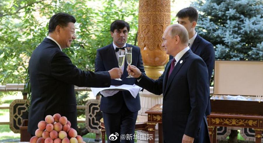 【俄羅斯總統(tǒng)普京當(dāng)面向習(xí)近平主席祝賀生日】俄羅斯塔斯社、俄新社6月15日上午報(bào)道稱,據(jù)俄總統(tǒng)新聞秘書佩斯科夫介紹,俄總統(tǒng)普京今天上午在杜尚別出席亞信第五次峰會前親自前往中國國家主席習(xí)近平下榻賓館,當(dāng)面向習(xí)主席祝賀66歲生日。普京高度評價習(xí)主席在俄中關(guān)系發(fā)展中發(fā)揮的重要作用,強(qiáng)調(diào)不久前習(xí)主席對俄進(jìn)行國事訪問取得圓滿成功,相信俄中關(guān)系將繼續(xù)保持良好發(fā)展勢頭。習(xí)主席對普京表示感謝,指出普京在中國很受歡迎。普京總統(tǒng)向習(xí)主席贈送俄羅斯冰淇淋,習(xí)主席回贈中國茶葉。