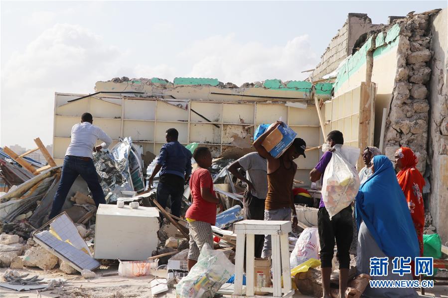 6月15日,在索馬里首都摩加迪沙,人們從汽車炸彈襲擊損壞的房屋中清理物品。新華社發(哈桑 攝)