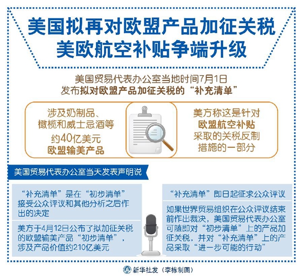 新華社華盛頓7月1日電(記者熊茂伶 鄧仙來(lái))美國(guó)貿(mào)易代表辦公室1日發(fā)布擬對(duì)歐盟產(chǎn)品加征關(guān)稅的“補(bǔ)充清單”,涉及奶制品、橄欖和威士忌酒等約40億美元?dú)W盟輸美產(chǎn)品。美方稱這是針對(duì)歐盟航空補(bǔ)貼采取的關(guān)稅反制措施的一部分。