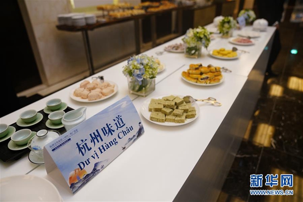 這是7月3日在越南首都河內拍攝的推介會上展出的杭州美食。新華社發(法鑫 攝)