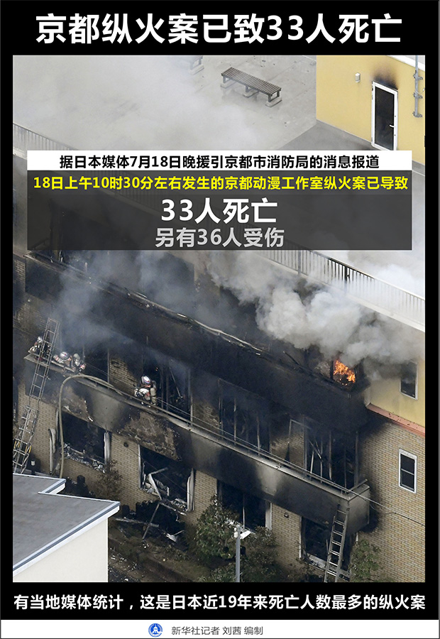 18日上午發生在日本京都動畫第一工作室的縱火案造成嚴重傷亡。據日本共同社報道,目前已確認33人死亡、36人受傷。有當地媒體統計,這是日本近19年來死亡人數最多的縱火案。