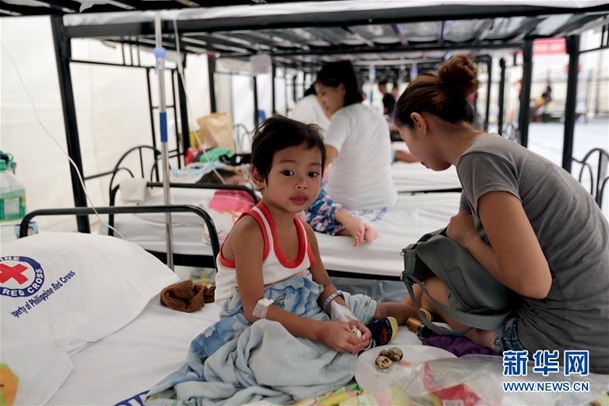 8月13日,在菲律賓甲米地省一處登革熱應急醫療站,一名母親照顧自己患病的孩子。新華社發(魯埃勒·烏馬利 攝)