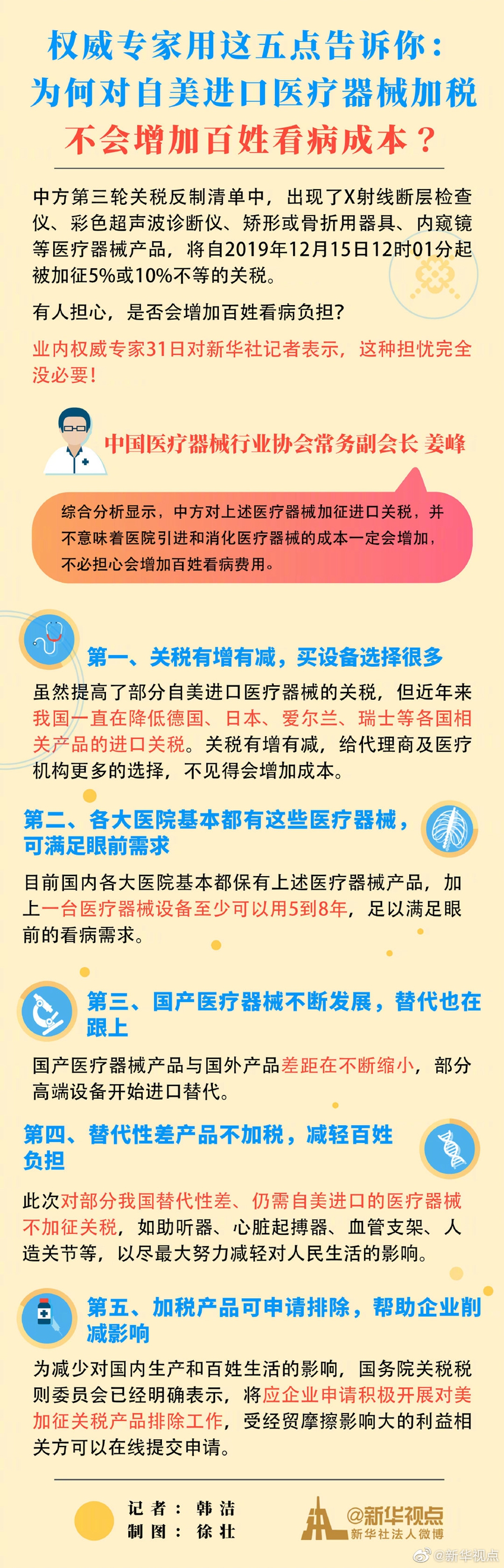 對(duì)此,中國(guó)醫(yī)療器械行業(yè)協(xié)會(huì)常務(wù)副會(huì)長(zhǎng)姜峰31日接受記者采訪時(shí)說(shuō),綜合分析顯示,中方對(duì)上述醫(yī)療器械加征進(jìn)口關(guān)稅,并不意味著醫(yī)院引進(jìn)和消化醫(yī)療器械的成本一定會(huì)增加,不必?fù)?dān)心會(huì)增加百姓看病費(fèi)用。