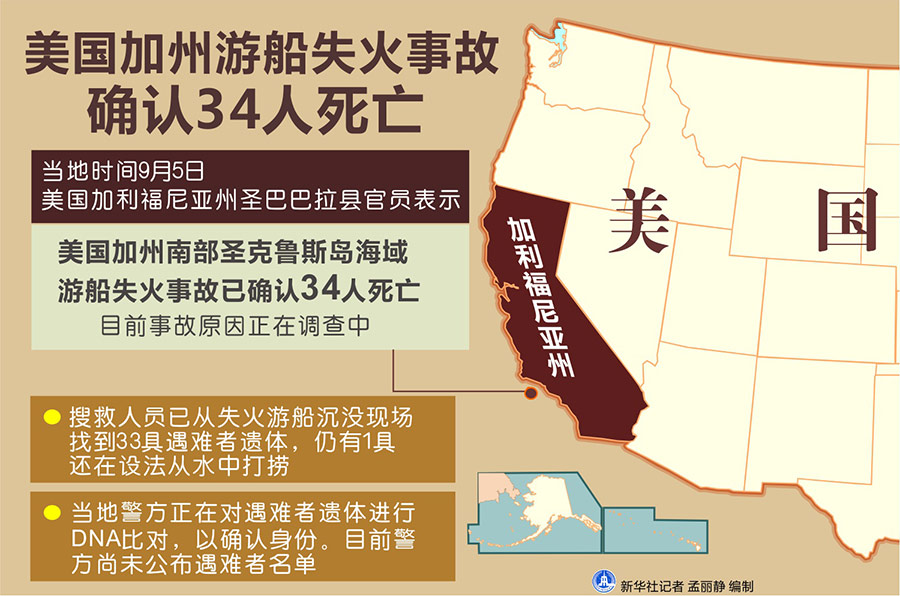 新華社洛杉磯9月5日電(記者譚晶晶 高山)美國加利福尼亞州圣巴巴拉縣官員5日表示,美國加州游船失火事故已確認34人死亡。目前事故原因正在調查中。