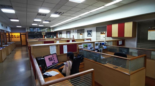 文卡特斯瓦倫負責(zé)《印度教徒報》的頭條版樣設(shè)計。他的辦公室門口,整整齊齊地碼放著其他報紙的刊樣。