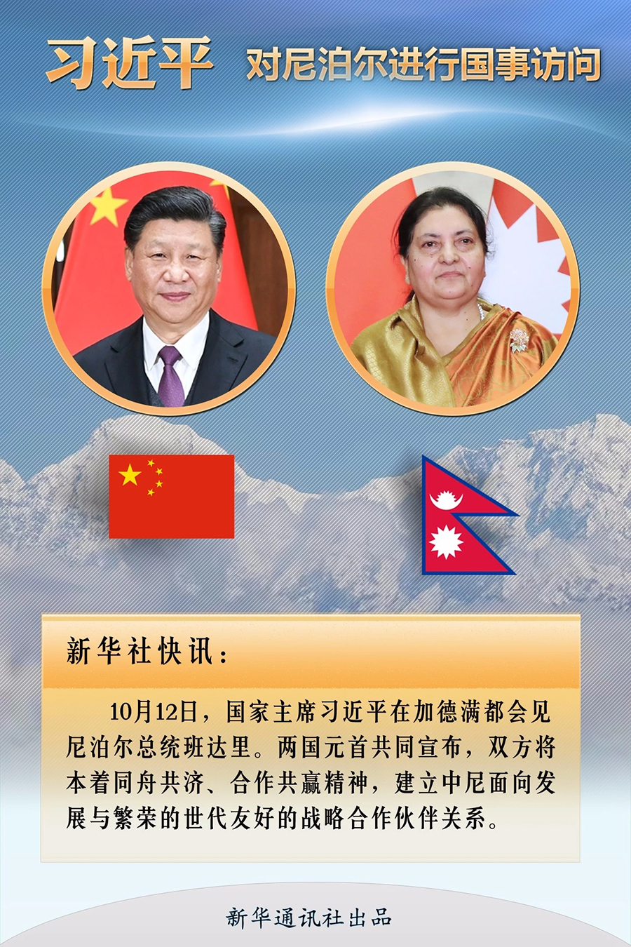 新華社加德滿(mǎn)都10月12日電 10月12日,國(guó)家主席習(xí)近平在加德滿(mǎn)都會(huì)見(jiàn)尼泊爾總統(tǒng)班達(dá)里。兩國(guó)元首共同宣布,雙方將本著同舟共濟(jì)、合作共贏精神,建立中尼面向發(fā)展與繁榮的世代友好的戰(zhàn)略合作伙伴關(guān)系。